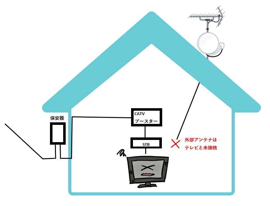 今回のテレビ受信不具合は屋根にテレビアンテナがあり、尚且つケーブルテレビ用の保安器があるため、どちらが物理的に現在テレビにつながっているか確認することで問題解決の提案ができました。
